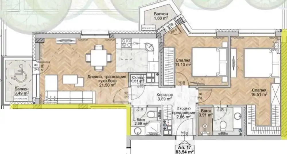Върху площ от 96 кв.м са разположени хол с трапезария и кухненски бокс (22 кв.м), две спални съответно 17 и 11 кв.м, две бани и две тераси.