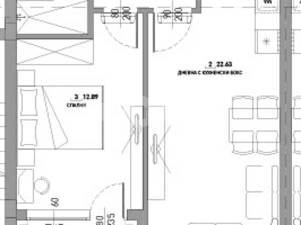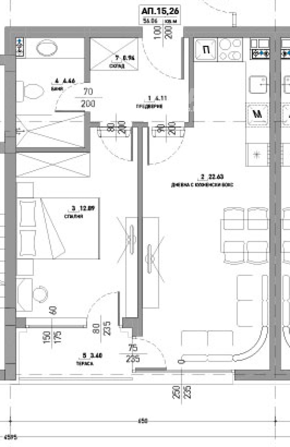 Разпределение: входно антре 4,11 кв.м, дневна с кухненски бокс 22,63 кв.м и излаз на балкон 3,48 кв.м, спалня 12,89 кв.м и баня с тоалетна 4,46 кв.м.