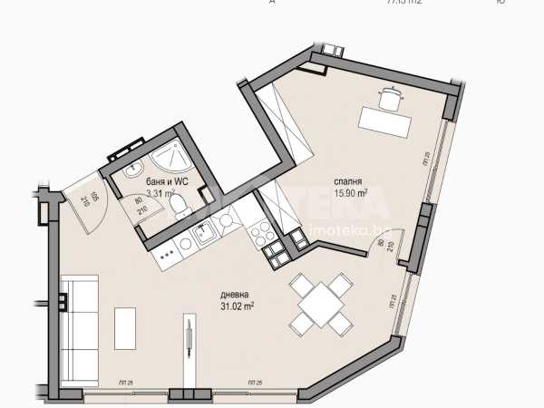 Отличен двустаен апартамент с обща площ от 77.15кв.м.