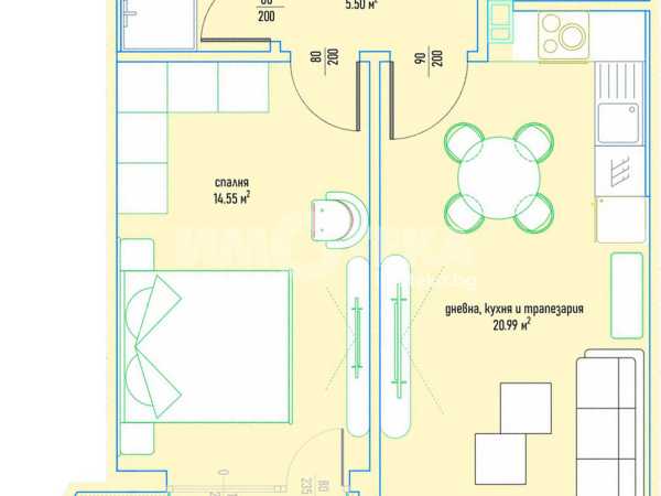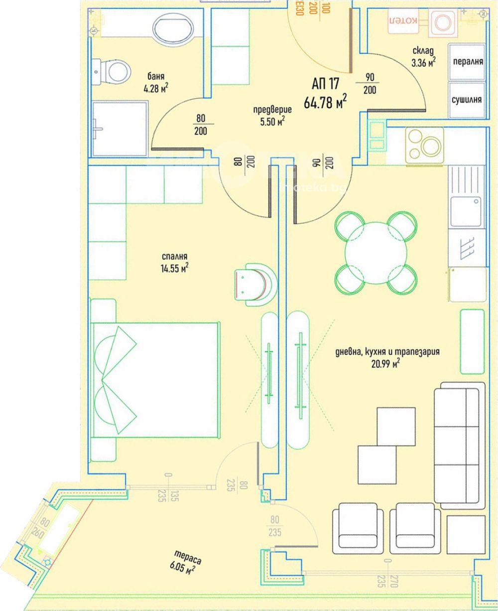Двустаен апартамент със застроена площ от 64.78кв.м. и 79.59 кв.м. с общите части. Състои се от: просторна дневна с кухненски бокс и трапезария, голяма спалня, баня с тоалетна, мокро помещение и балкон. Изложението е западно. Има възможност за закупуване на паркомясто или гараж.