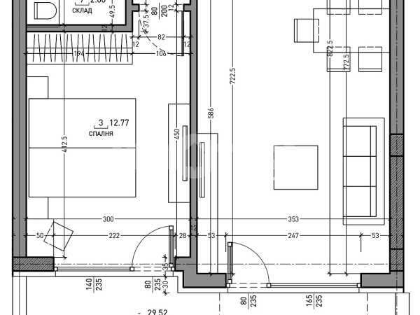 Апартаментът е площ 70.09 кв.м. ОП // 59.12 кв.м. с двор от 29.52 кв.м.