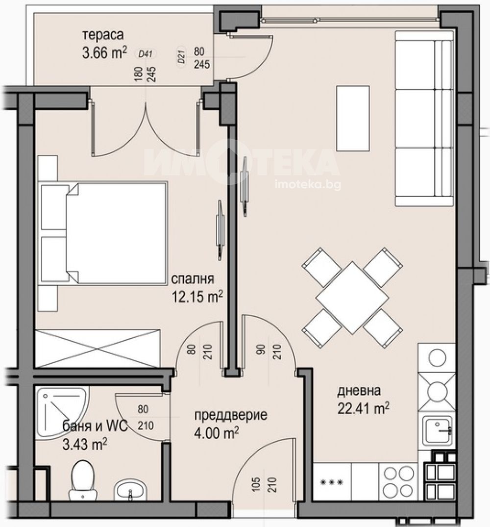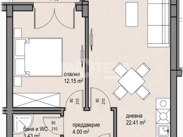 Имотът е със следното разпределение: входно антре, спалня, просторен хол с кухненски бокс, баня с тоалетна, тераса. Мазе към апартамента.