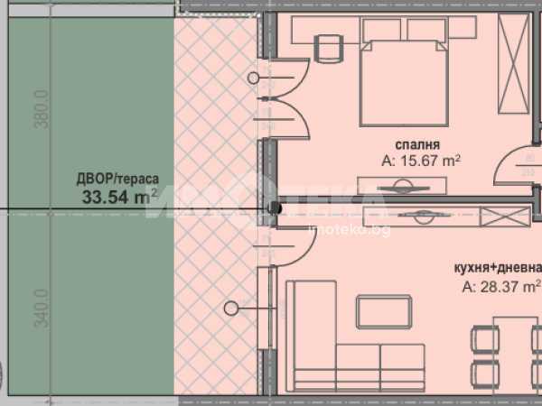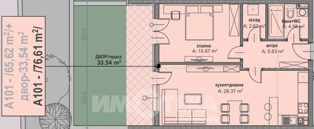 Двустаен апартамент с обща площ 76.61кв.м /ЗП 65.62 + ОЧ 10.99/ + 33.54 кв.м озеленен двор