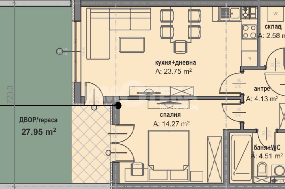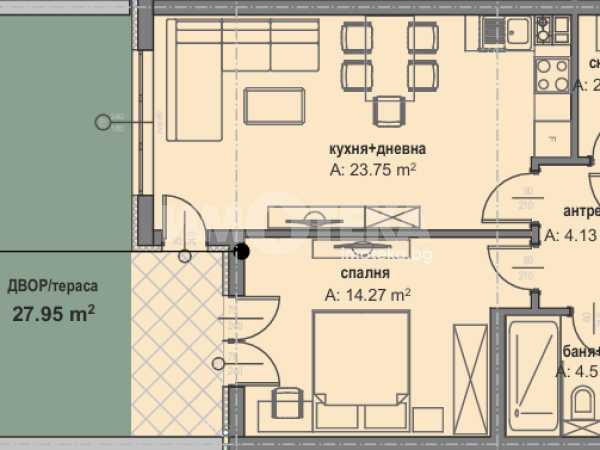 Двустаен апартамент с обща площ 66.62кв.м /ЗП 56.98 + ОЧ 9.64/ + 27.95 кв.м озеленен двор