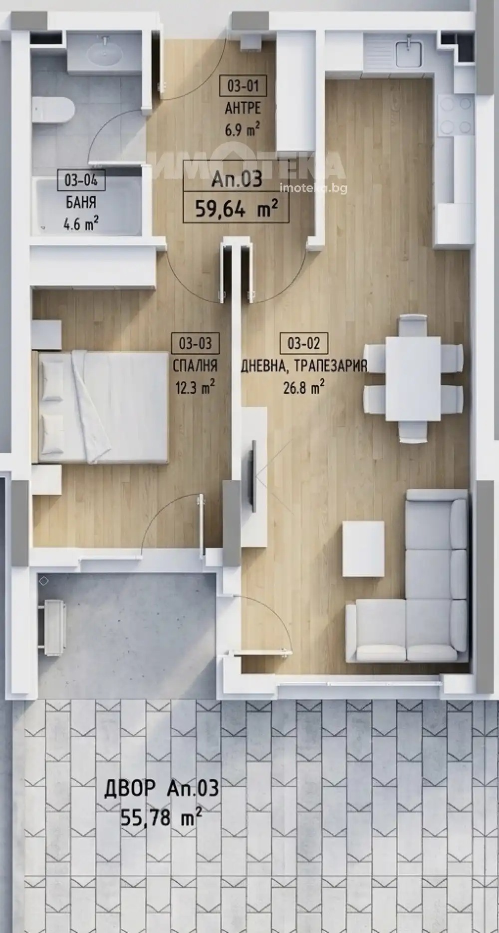 юни 2026г. Състои се от баня с тоалетна, коридор, спалня, дневна с