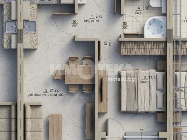 Двустаен апартамент 58кв.м., състоящ се от предверие, баня с