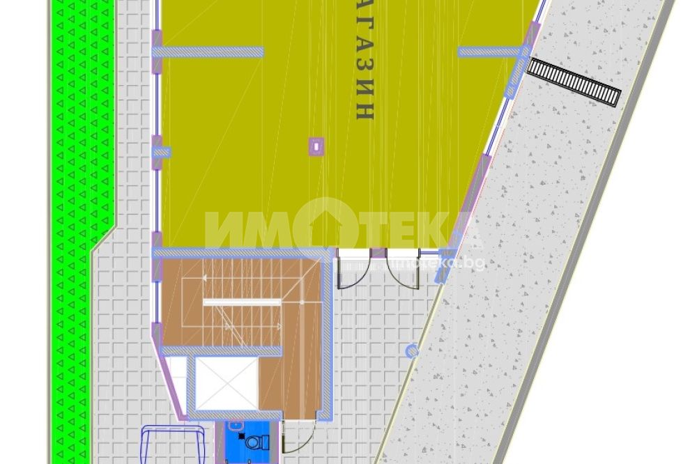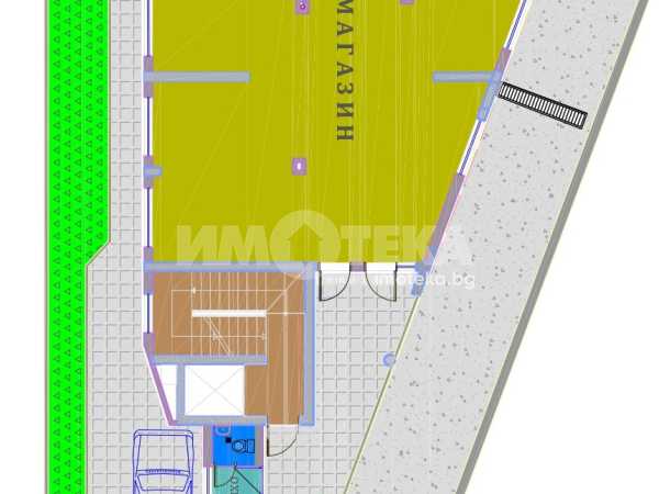 Магазин, разположен на кота ±0.00, със застроена площ 130,99 кв.м. Обектът се намира на партерно ниво на сградата и включва търговска зала, складово помещение и сервизни помещения. Достъпът до магазина е директен от улично ниво, чрез самостоятелен вход, осигуряващ удобство за посетители и товаро-разтоварни дейности. Фасадното остъкление позволява добра видимост към търговската площ. Обектът е подходящ за развиване на търговска дейност, офис, студио за услуги или друг вид обслужващи функции.