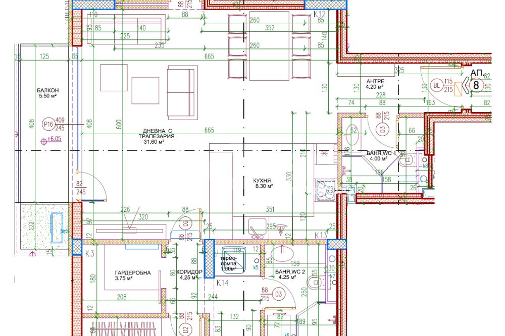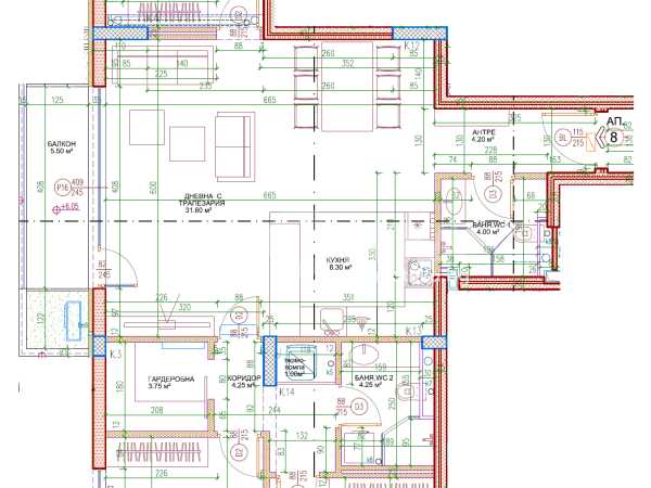 Многостаен апартамент на етаж трети/ втори над партер ЗП-129м2; РЗП-148,74м2-Дневна с кухненски бокс и трапезария-39,90м2, три големи спални, две бани, тоалетна, гардеробна, място за термопомпа и просторен балкон-5,10м. Изложение С/З/Ю. налични ПМ и гаражи.