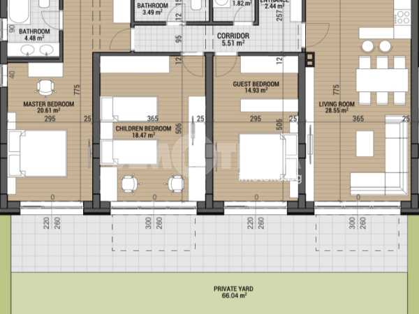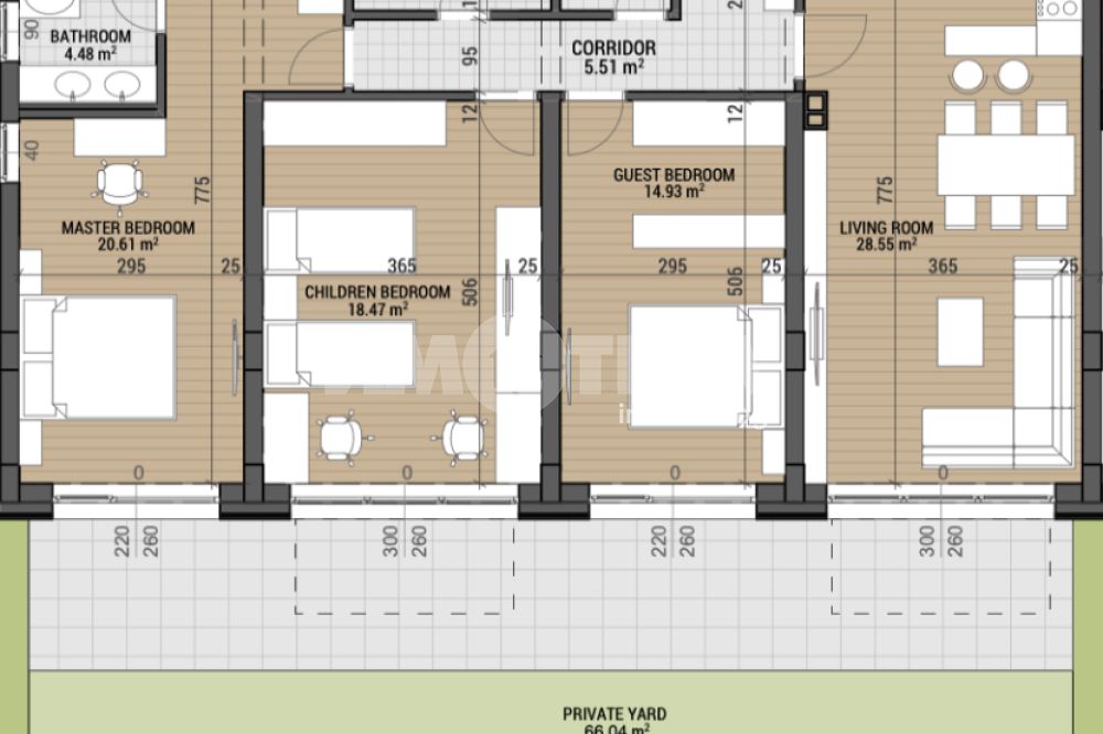 Многостаен апартамент на етаж първи /партерен/ със ЗП-119,74 кв.м., РЗП-153,36 кв.м., дворно място за индивидуално ползване към апартамента с площ от 66,04 кв.м. и идеални части от парцела равняващи се на 124,99 кв.м. Разпределение: Дневен тракт с кухня, 3 спални, 2 бани с тоалетни, склад. Изложение: Юг, Югозапад.