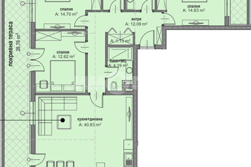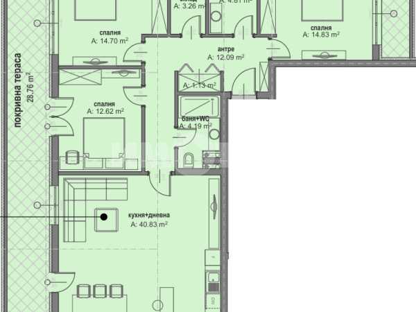 Многостаен апартамент с обща площ 168 кв.м /ЗП 142.58кв.м. + ОЧ 25.42кв.м./ + покривна тераса 28.52 кв.м + втора покривна тераса 4.82 кв.м.