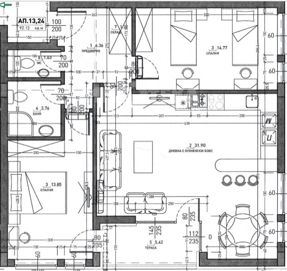 Отличен тристаен апартамент с обща площ от 105.61 кв.м. и ЗП 92,13 кв.м.