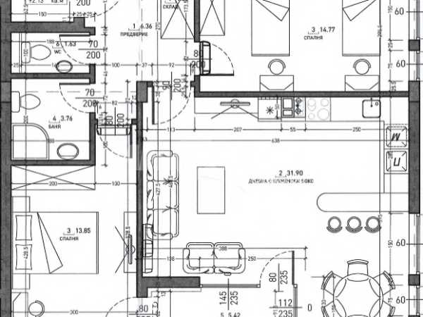 Състои се от: входно антре  , хол с кухненски бокс 31,90 кв.м.  и излаз на лоджия 5.42 кв.м., две спални 12,85 и 14,77 кв.м. , баня с тоалетна 3,96 кв.м. и отделна тоалетна 1.63 кв.м.