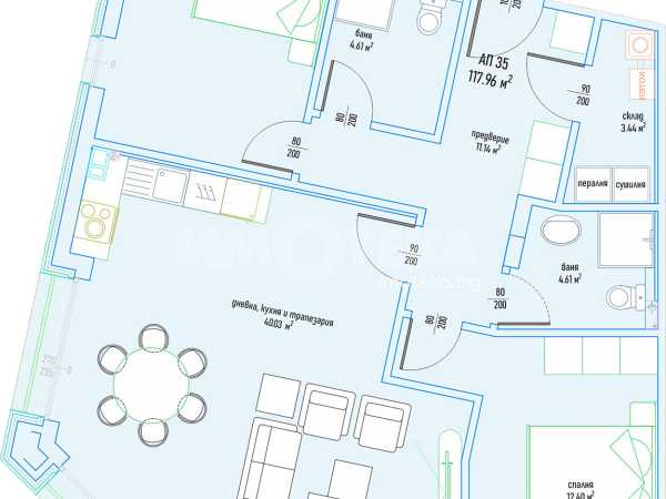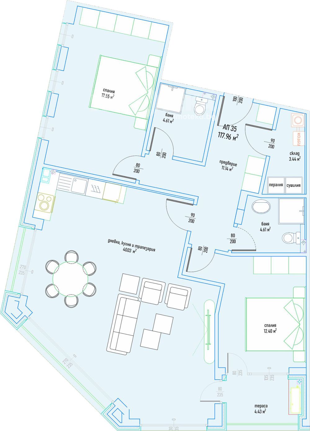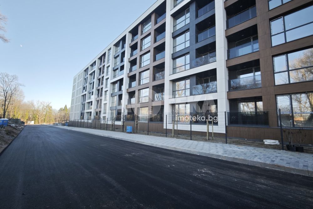Тристаен апартамент на етаж четири с изложение ЮЗ. Разположен върху площ от 117,96м2, апартаментът предлага следното разпределение: антре , дневна с кухненски бокс и трапезария-40м2, две спални, две бани с тоалетни, килер/мокро и балкон. Луксозен жилищен комплекс, разположен северно от Ring Mall и Ikea, в непосредствена близост до бул. Климент Охридски в красива зелена местност и уникална гледка към Витоша. Комплексът се намира на разстояние от 15 мин с автомобил до центъра на София и на 3 мин от Ring Mall.