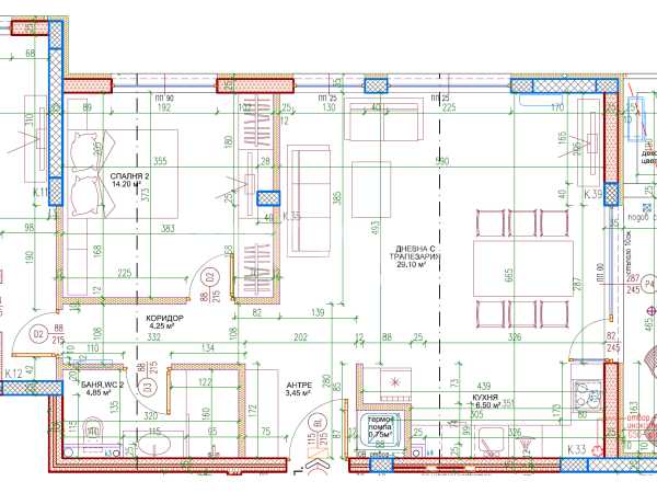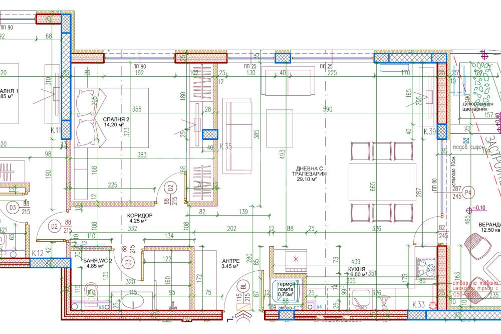 Тристаен апартамент на партерен етаж със ЗП-97м2, РЗП-111,79м2 и собствен двор-14,7м2 . Дневна с кухненски бокс и трапезария-35,6м2, две просторни спални, две бани, място за термопомпа и разкошна източна веранда-12,50м2. Изложение С/И. Налични ПМ и гаражи.