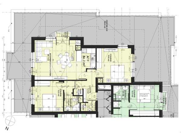Хол 29 кв. м, спални 15кв. м и 12 кв. м, две бани с тоалетни, склад, терасаи две по 0.80 кв. м.