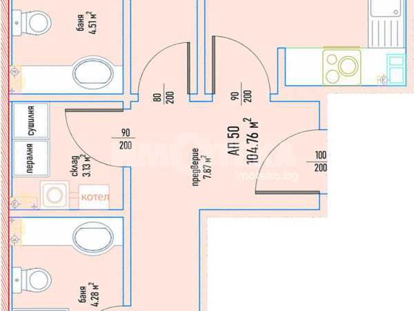 Тристаен с изложение И/З, застроена площп-104.76 м2, площ с общи части-126.39м2 и разпределение: антре, дневна с кухненски бокс и тарапезария, две спални, две бани с тоалетна, килер/мокро и два балкона.
