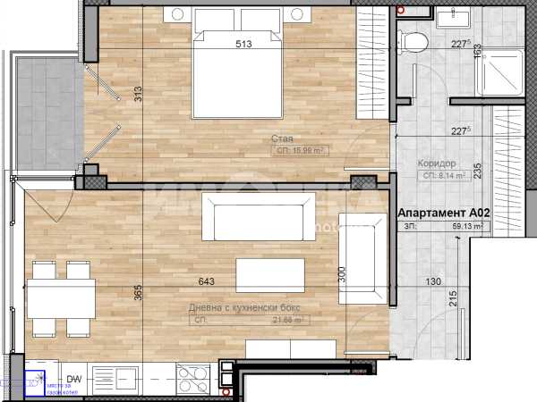 На метри от Южен парк! Двустаен апартамент на етаж втори над офис с разпределение: антре, дневна с кухненски бокс и трапезария - 21,68м2, спалня-15,98м2, баня с тоалетна и тераса. Жилището е с РЗП - 69,68м2 и ЗП - 59,13м2. Отопление ГАЗ. Възможност за покупка на ПМ. Цена без ддс. Към апартамента има и мазе с площ от 2,22м2 , находящо се в сутерена на сградата на отделна цена.