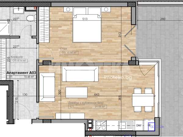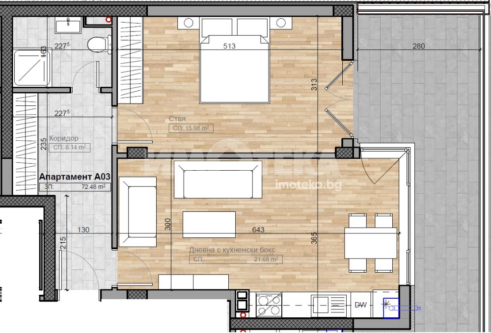 На метри от Южен парк! Двустаен апартамент на етаж втори над офис с разпределение: антре, дневна с кухненски бокс и трапезария - 21,68м2, спалня-15,98м2, баня с тоалетна и просторна тераса. Жилището е с РЗП - 85,94м2 и ЗП - 72,48м2. Отопление ГАЗ. Възможност за покупка на ПМ. Цена без ддс. Към апартамента има и мазе с площ от 2,21м2 , находящо се в сутерена на сградата на отделна цена.