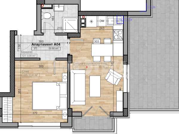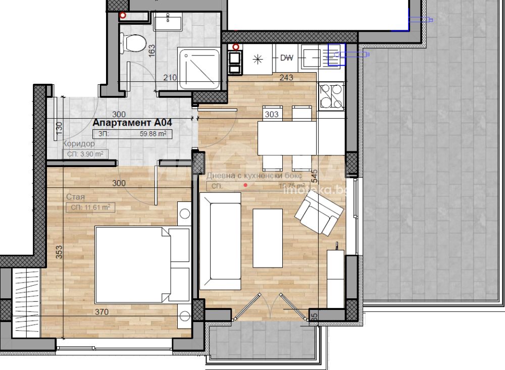 Двустаен апартамент на етаж втори над офис с разпределение: антре, дневна с кухненски бокс и трапезария - 15,75м2, спалня-11,61м2, баня с тоалетна и просторна тераса. Жилището е с РЗП -71,22м2 и ЗП - 59,88м2. Възможност за покупка на ПМ. Цена без ддс. Към апартамента има и мазе с площ от 1,37м2 , находящо се в сутерена на сградата на отделна цена.