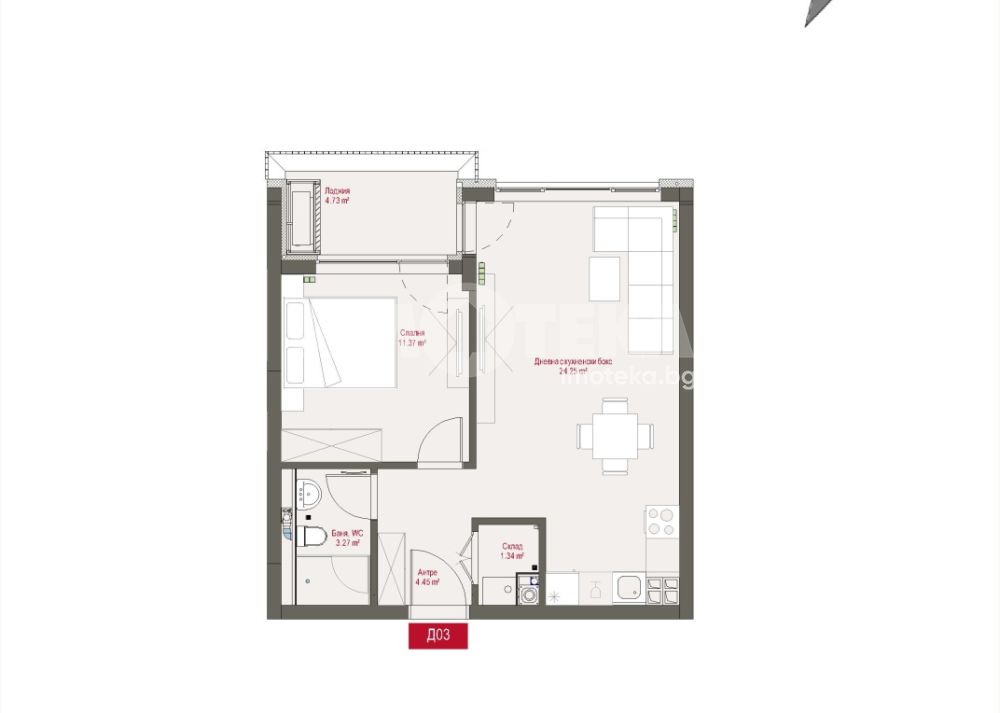 Двустаен апартамент разположен на втори етаж. Изложение Запад. Застроената площ на жилището е 59 кв.м., разпределени в антре, всекидневна с кухненски бокс и излаз към лоджия, спалня, баня с тоалетна и склад.