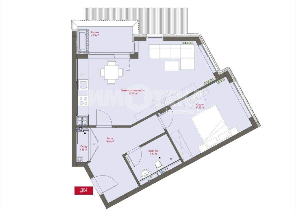 Двустаен апартамент разположен на втори етаж. Изложение Запад-Север. Застроената площ на жилището е 75 кв.м., разпределени в просторно антре, всекидневна с кухненски бокс и излаз към лоджия, спалня, баня с тоалетна и склад.