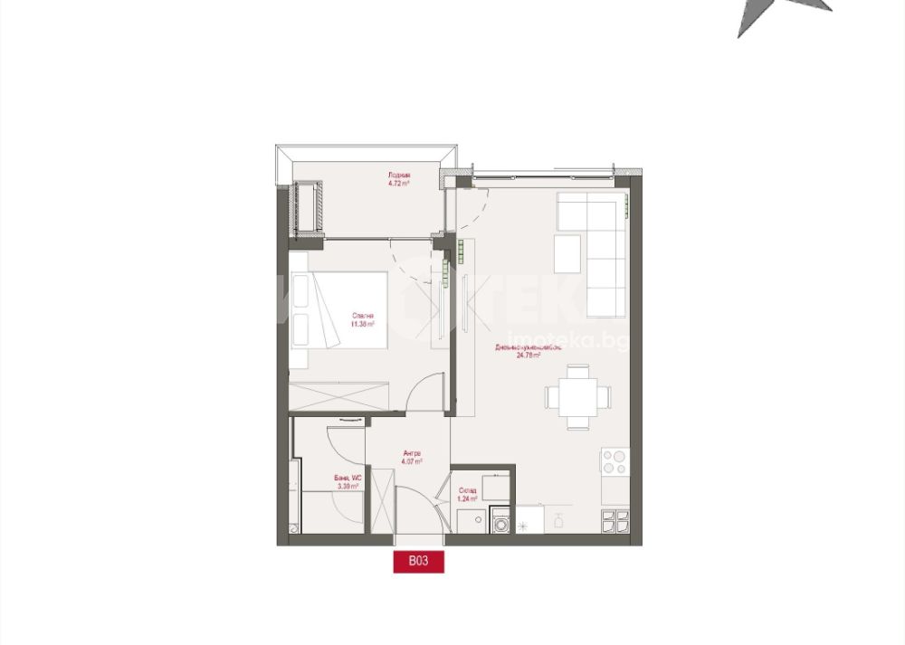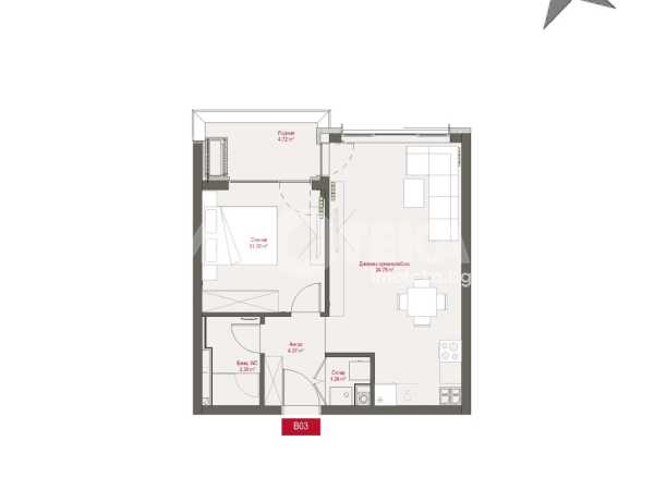 Двустаен апартамент разположен на втори етаж. Изложение Запад. Застроената площ на жилището е 59 кв.м., разпределени в антре, всекидневна с кухненски бокс и излаз към лоджия, спалня, баня с тоалетна и склад.