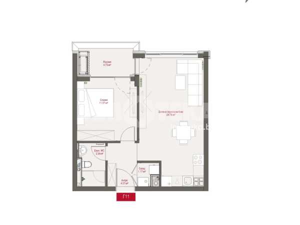 Двустаен апартамент разположен на трети етаж. Изложение Запад. Застроената площ на жилището е 59 кв.м., разпределени в антре, всекидневна с кухненски бокс и излаз към лоджия, спалня, баня с тоалетна и склад.