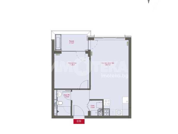 Двустаен апартамент разположен на трети етаж. Изложение Север. Застроената площ на жилището е 59 кв.м., разпределени в антре, всекидневна с кухненски бокс и излаз към лоджия, спалня, баня с тоалетна и склад.