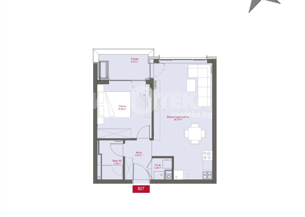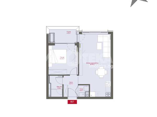 Двустаен апартамент разположен на трети етаж. Изложение Запад. Застроената площ на жилището е 59 кв.м., разпределени в антре, всекидневна с кухненски бокс и излаз към лоджия, спалня, баня с тоалетна и склад.
