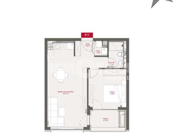 Двустаен апартамент разположен на трети етаж. Изложение Изток. Застроената площ на жилището е 62 кв.м., разпределени в антре, всекидневна с кухненски бокс и лоджия, от която се разкрива гледка към вътрешния двор на сградата, спалня, баня с тоалетна, дрешник и склад.