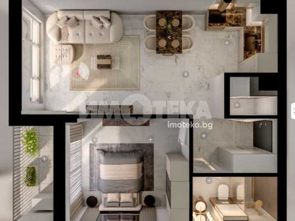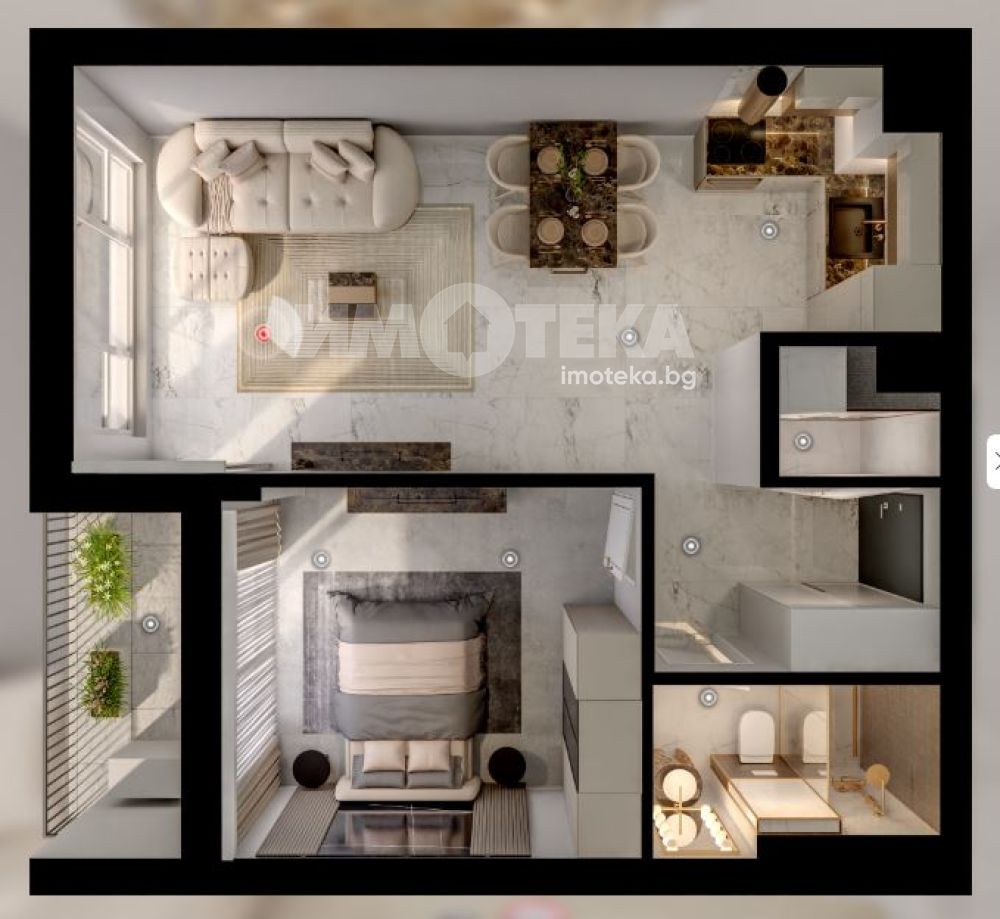 Апартамент с една спалня в новострояща се сграда, проектиран с внимание към удобството и функционалността. Апартаментът разполага с просторна дневна зона , обединяваща хол, трапезария и кухня в едно пространство, спалня, входно антре с място за гардероб , тераса , баня с тоалетна и складово помещение.