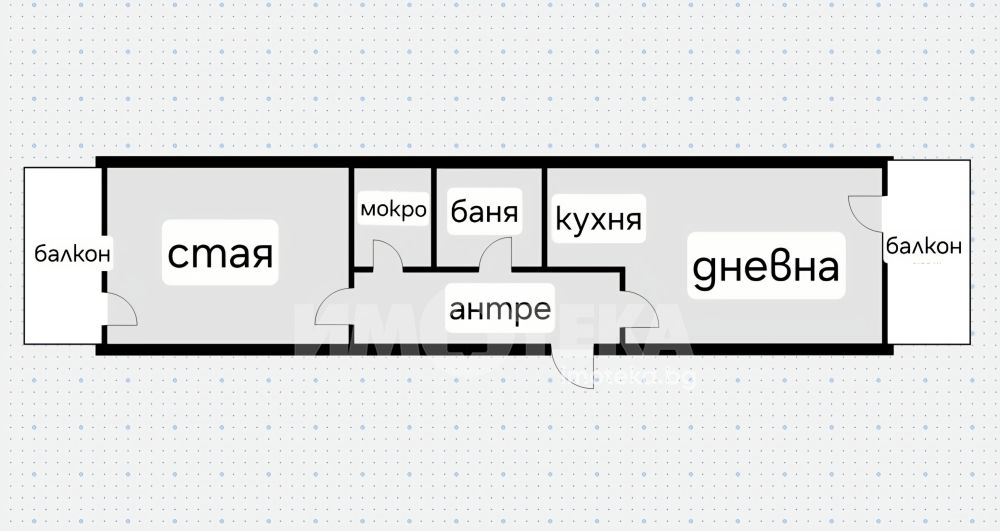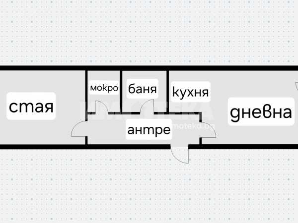 - разпределение: входно антре, коридор, всекидневна с кухненски бокс и тераса, баня с тоалетна, мокро помещение, спалня с тераса