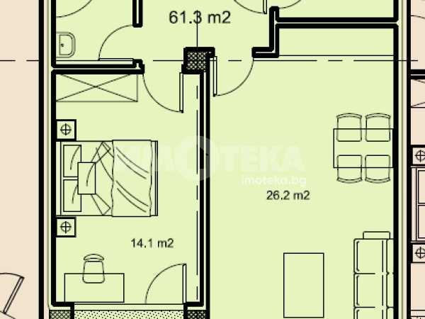Разпределението е както следва: входно антре, мокро помещение, баня с тоалетна, кухня с дневна 26 кв.м с излаз към зимна градина 3.7 кв.м, спалня 14 кв.м.