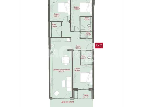 Многостаен апартамент разположен на първи жилищен етаж. Изложение Юг-Север. Застроената площ на жилището е 130 кв.м., разпределени в антре, просторна всекидневна с кухненски бокс и излаз към двор, от който се разкрива гледка към зелените пространства на сградата, три спални, едната с тераса, три бани с тоалетни и дрешник.