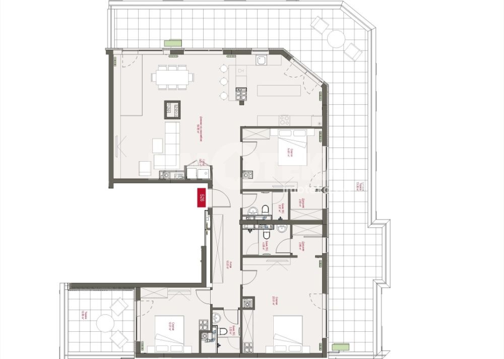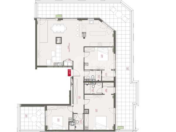 Многостаен панорамен апартамент с три изложения разположен на шести етаж. Изложение Юг-Изток-Запад. Застроената площ е 255 кв.м. Жилището се състои от просторно антре с дрешник и склад, две бани с тоалетна, огромна всекидневна, разделена на дневен тракт, кухненска част и трапезария и излаз към панорамна тераса, от която се разкрива изключителна гледка към Витоша планина, три спални - едната е родителска със собствена баня, тоалетна и дрешник, втората спалня също е със собствен дрешник, а третата спалня разполага с малка, но много приятна тераса, гледаща към вътрешния двор на сградата.