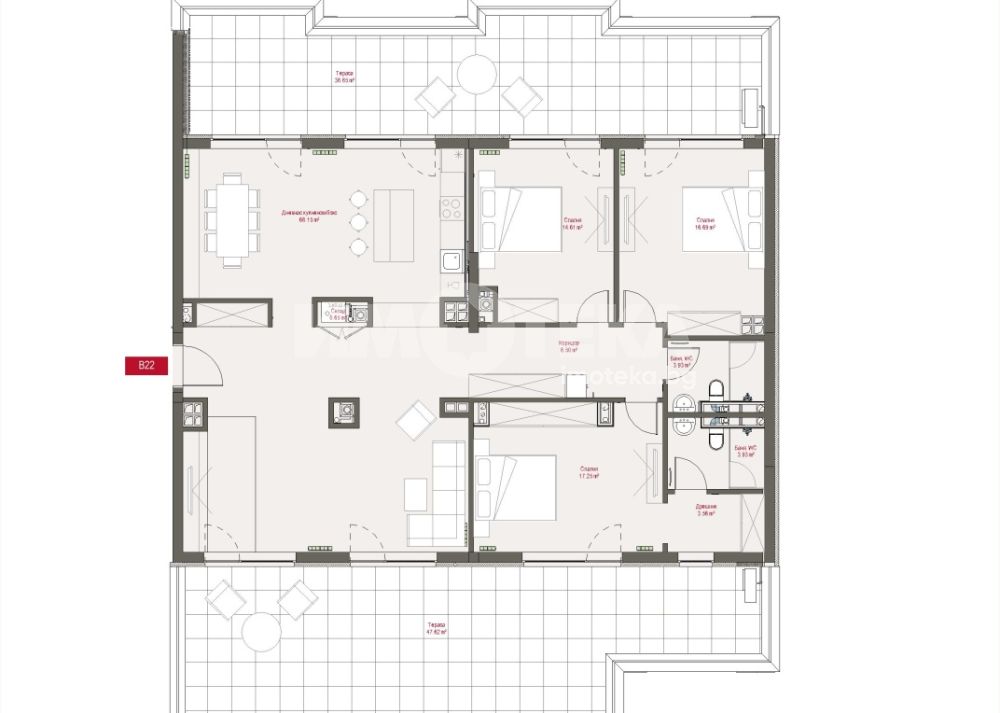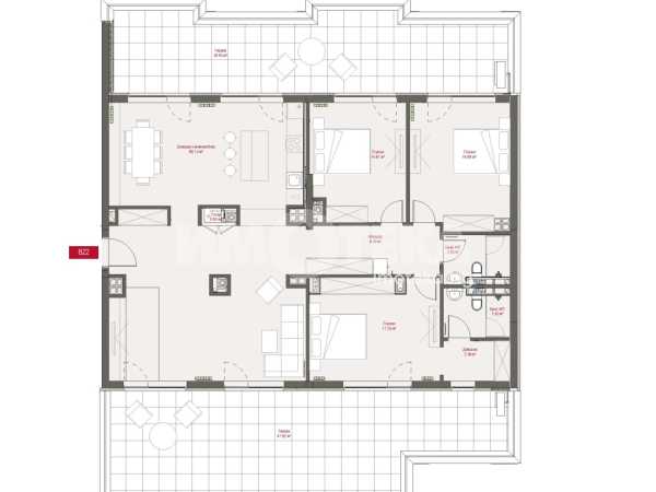 Многостаен апартамент разположен на шести етаж. Изложение Изток-Запад. Застроената площ е 248 кв.м. Жилището се състои от просторно антре със склад, коридор, дрешник, самостоятелна баня с тоалетна, три спални - едната е родителска със собствена баня, тоалетна и дрешник, както и огромна всекидневна, в която са обособени дневен тракт, кухня и трапезария. Апартаментът разполага и с две панорамни тераси, разкриващи много хубави гледки към зелените пространства около сградата и Витоша планина.