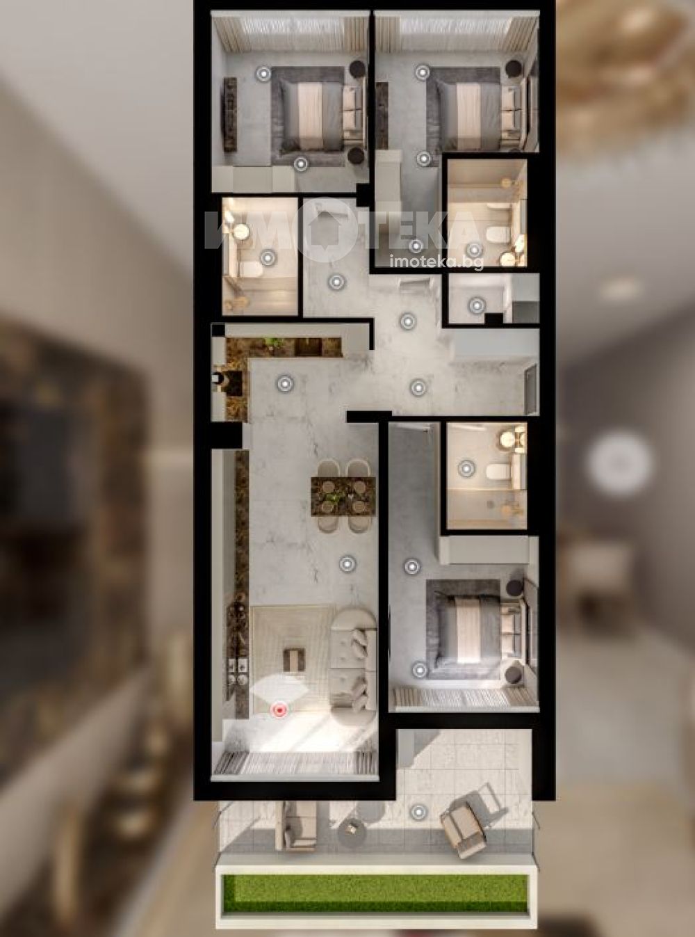 Жилището е с функционално и удобно разпределение. Просторната дневна 37кв.м обединява хол, трапезария и кухня в едно общо помещение с излаз към дворна  тераса.  Трите непреходни  спални осигуряват комфорт и уединение. Към две от тях има баня с тоалетна.