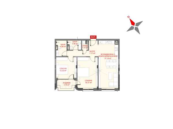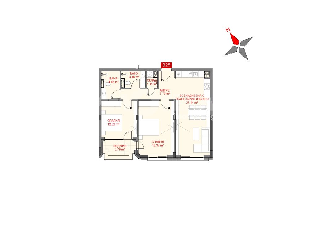 Тристаен апартамент с изложение ЮГ. Състои се от входно антре със складово помещение ,  две бани с тоалетна, две спални , дневна с трапезария и кухненски бокс и тераса с гледка към Витоша.