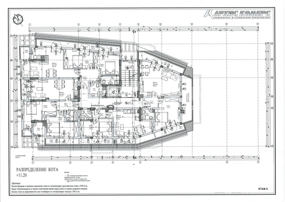 Сграда пред Акт 16 с висококачествени материали и модерен дизайн. Фасадата е с интегрирана топлоизолационна система "Baumit". PVC дограма със стъклопакет тип четири сезона. Блиндирани входни врати на "Солид". Изградено окабеляване за кабелна телевизия, интернет, звънчева и домофонна инсталация. Изградени трасета за вентилация за подземни гаражи, тоалетни, бани и кухненски боксове. Изградени трасета за отопление във всяка стая. Газова инсталация до тапа. Асансьор "Kone". Общите части са с гранит и гранитогрес, парапетите са по проект. Изцяло изградена вертикална планировка, съгласно утвърден проект за паркоустройство и благоустройство. Шпакловка и замазка.