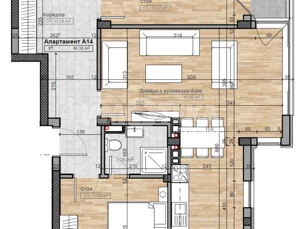 На метри от Южен парк! ристаен апартамент на етаж ПЕТИ с разпределение: антре, дневна с кухненски бокс и трапезария - 31.00м2, две спални, две бани с тоалетни и две тераси. Жилището е с РЗП -118,30м2 и ЗП - 99,30м2. Отопление ГАЗ. Възможност за покупка на ПМ. Цена без ддс. Към апартамента има и мазе с площ от 2,85м2 , находящо се в сутерена на сградата.