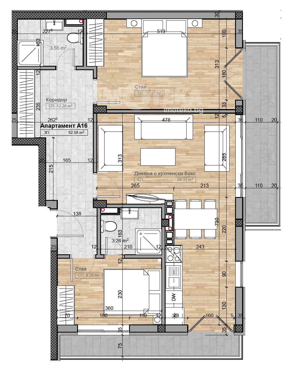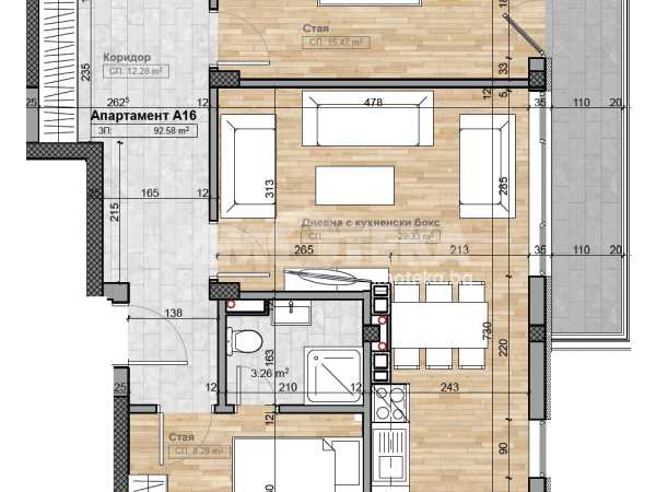 На метри от Южен парк! Тристаен апартамент на етаж ШЕСТИ с разпределение: антре, дневна с кухненски бокс и трапезария - 29,33м2, две спални, две бани с тоалетни и две тераси. Жилището е с РЗП -110,30м2 и ЗП - 92,58м2. Отопление ГАЗ. Възможност за покупка на ПМ. Цена без ддс. Към апартамента има и мазе с площ от 4,37м2 , находящо се в сутерена на сградата на отделна цена.