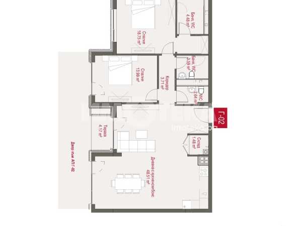 Тристаен апартамент разположен на първи жилищен етаж. Изложение Изток. Застроената площ на жилището е 118 кв.м., разпределени в просторна всекидневна с кухненски бокс и тераса с излаз към двор, от които се разкрива гледка към зелените пространства на сградата, коридор, две спални, две бани с тоалетни, самостоятелна тоалетна и дрешник.
