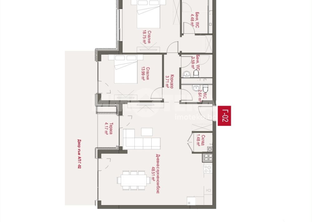 Тристаен апартамент на две нива, разположен на първи жилищен етаж. Изложение Изток. Застроената площ на жилището е 124 кв.м. Първо ниво се състои от антре, баня с тоалетна, дрешник, просторна всекидневна с кухненски бокс и тераса с излаз към двор, от които се разкрива гледка към зелените пространства на сградата. Второ ниво се състои от две спални, едната с тераса, баня с тоалетна и дрешник.