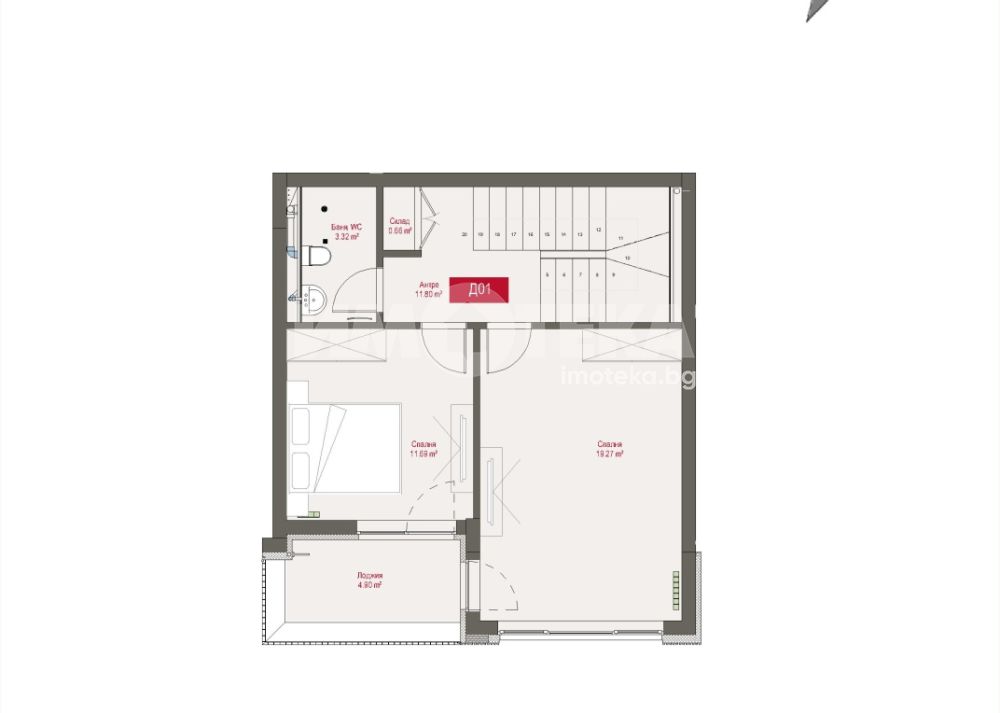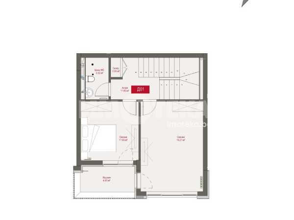 Тристаен апартамент на две нива, разположен на първи жилищен етаж. Изложение Изток. Застроената площ на жилището е 158 кв.м. Първо ниво се състои от антре, баня с тоалетна, дрешник, просторна всекидневна с кухненски бокс и тераса с излаз към двор, от които се разкрива гледка към зелените пространства на сградата. Второ ниво се състои от две спални, едната с тераса, баня с тоалетна и дрешник.