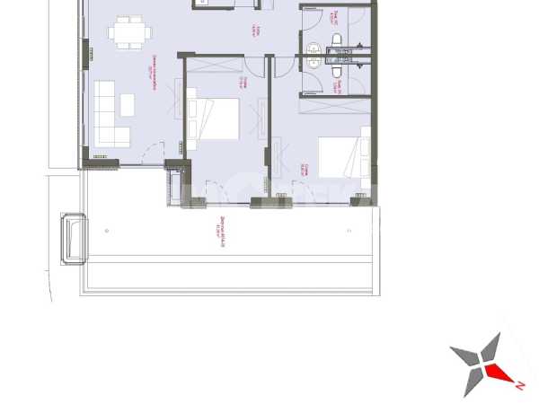 Тристаен апартамент разположен на първи жилищен етаж. Изложение Изток-Север. Застроената площ на жилището е 105 кв.м., разпределени в просторна всекидневна с кухненски бокс и излаз към двор, от който се разкрива гледка към зелените пространства на сградата, антре, две спални, едната със собствена баня с тоалетна, втора баня с тоалетна и дрешник/мокро помещение.
