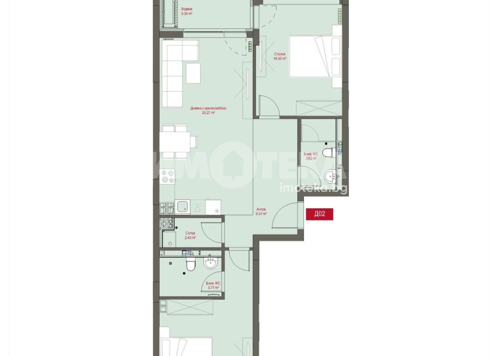 Тристаен апартамент разположен на втори етаж. Изложение Изток-Запад. Застроената площ на жилището е 96 кв.м., разпределени в просторно антре, всекидневна с кухненски бокс и излаз към лоджия, две спални, две бани с тоалетна и склад.