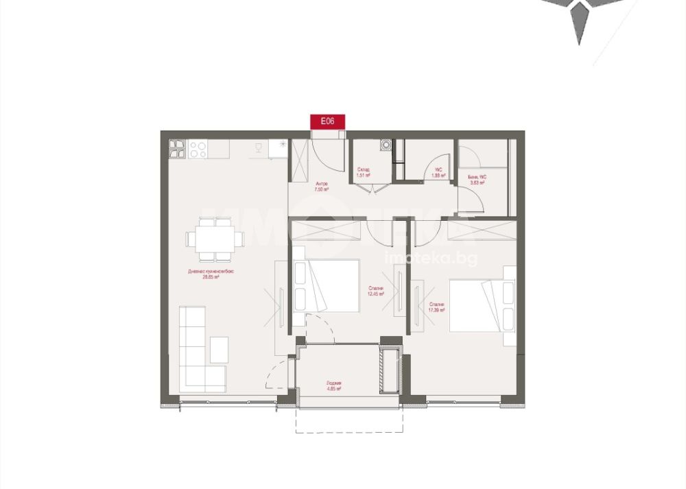 Тристаен апартамент разположен на втори етаж. Изложение Юг. Застроената площ на жилището е 91 кв.м., разпределени в антре, просторна всекидневна с кухненски бокс и излаз към лоджия, от която се разкрива гледка към зелените пространства на сградата и Витоша планина, две спални, баня с тоалетна, отделна тоалетна и склад.