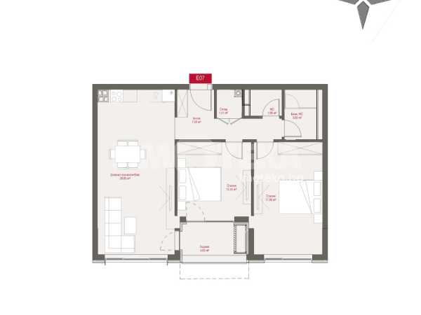 Тристаен апартамент разположен на втори етаж. Изложение Юг. Застроената площ на жилището е 94 кв.м., разпределени в антре, всекидневна с кухненски бокс и излаз към лоджия, от която се разкрива гледка към зелените пространства на сградата и Витоша планина, две спални, баня с тоалетна, самостоятелна тоалетна и склад.