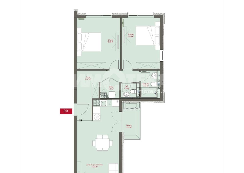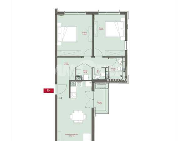 Тристаен апартамент разположен на втори етаж. Изложение Юг-Изток. Застроената площ на жилището е 97 кв.м., разпределени в антре, южна всекидневна с кухненски бокс и излаз към лоджия, от която се разкрива гледка към зелените пространства на сградата и Витоша планина, две спални, баня с тоалетна, самостоятелна тоалетна и склад.