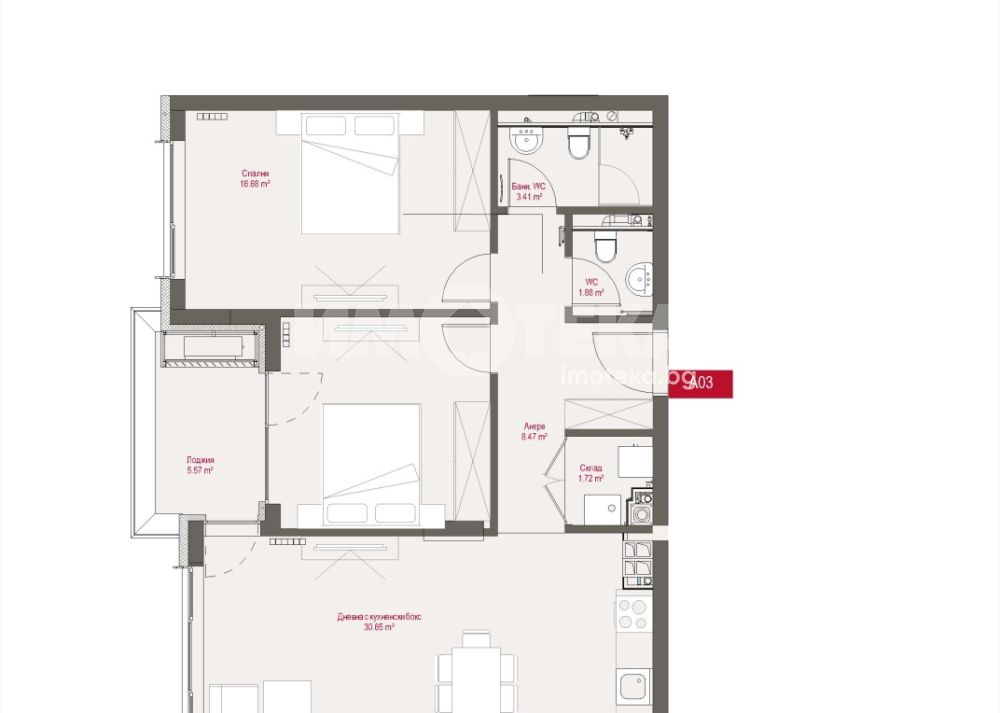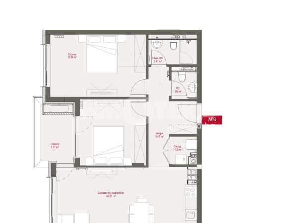 Тристаен апартамент разположен на втори етаж. Изложение Юг-Изток. Застроената площ на жилището е 95 кв.м., разпределени в антре, просторна всекидневна с кухненски бокс и излаз към лоджия, от която се разкрива гледка към зелените пространства на сградата и Витоша планина, две спални, баня с тоалетна, самостоятелна тоалетна и склад.